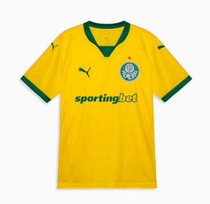 O uniforme THIRD é inspirado na escalação 100% alviverde da Primeira Academia. O sign off “Palmeiras, Meu Palmeiras” na gola convida o torcedor a vestir não apenas um uniforme, mas uma bandeira, um grito que ecoa nas arquibancadas. A camisa é amarelo vibrante com detalhes em verde, acompanhada de short azul e meiões brancos com faixas verdes e amarelas. Entre os elementos visuais estão o embossing frontal com “Maior Campeão do Brasil”, o “P” em louros e a nova gola em V com recorte moderno, exclusivo da PUMA, e o tecido com brilho sutil que entrega estética elegante e imponente.