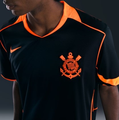 A nova camisa III do Corinthians celebra a Era Total 90, lembrando o time histórico que marcou época em 2005. O manto resgata esse legado com design totalmente preto e detalhes em laranja no Swoosh, escudo, gola e mangas, mantendo a estética clássica da época. O icônico círculo Total 90 retorna em destaque, agora trazendo o número do jogador abaixo do Swoosh, simbolizando a força e a identidade do Total Corinthians.