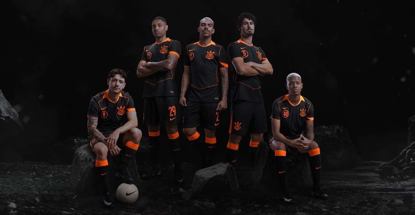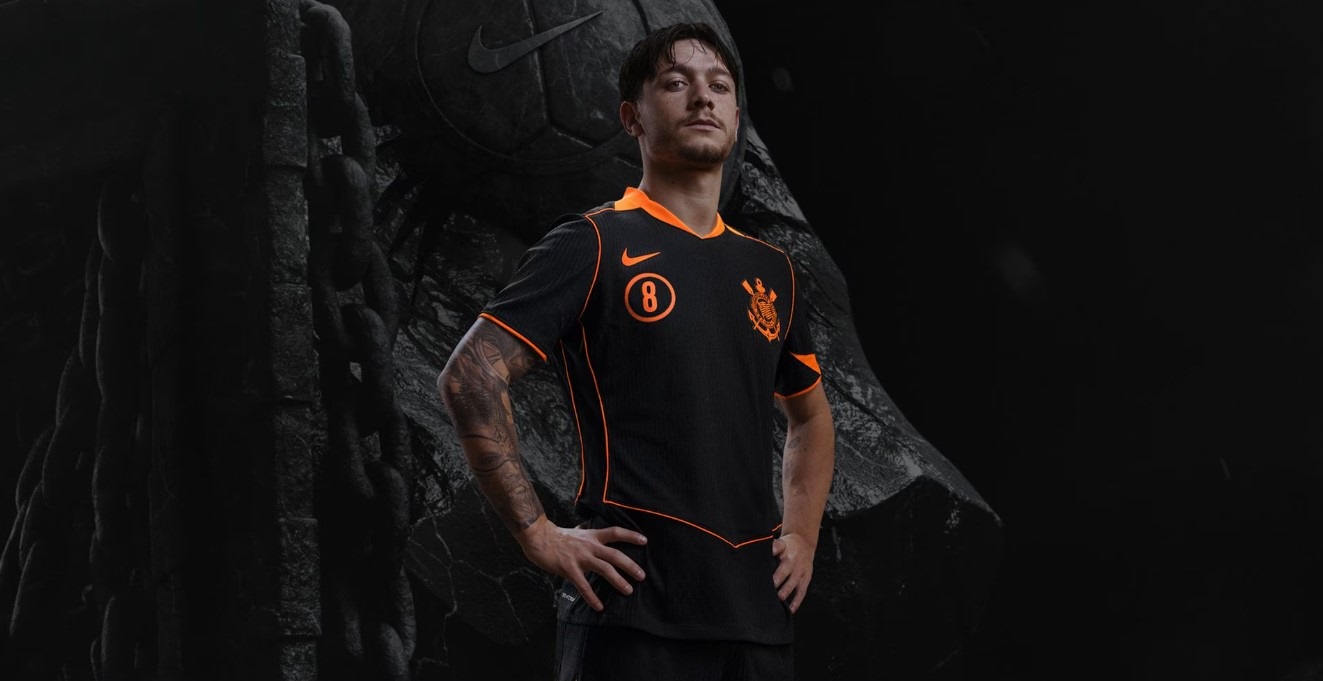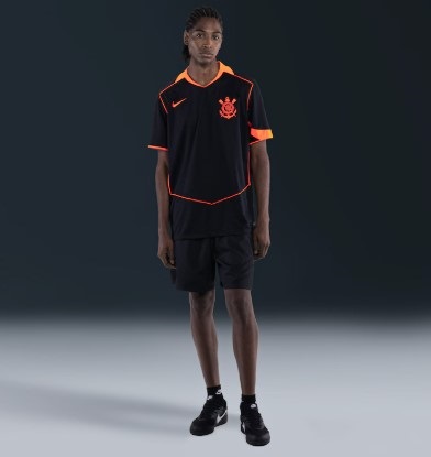A nova camisa III do Corinthians celebra a Era Total 90, lembrando o time histórico que marcou época em 2005. O manto resgata esse legado com design totalmente preto e detalhes em laranja no Swoosh, escudo, gola e mangas, mantendo a estética clássica da época. O icônico círculo Total 90 retorna em destaque, agora trazendo o número do jogador abaixo do Swoosh, simbolizando a força e a identidade do Total Corinthians.